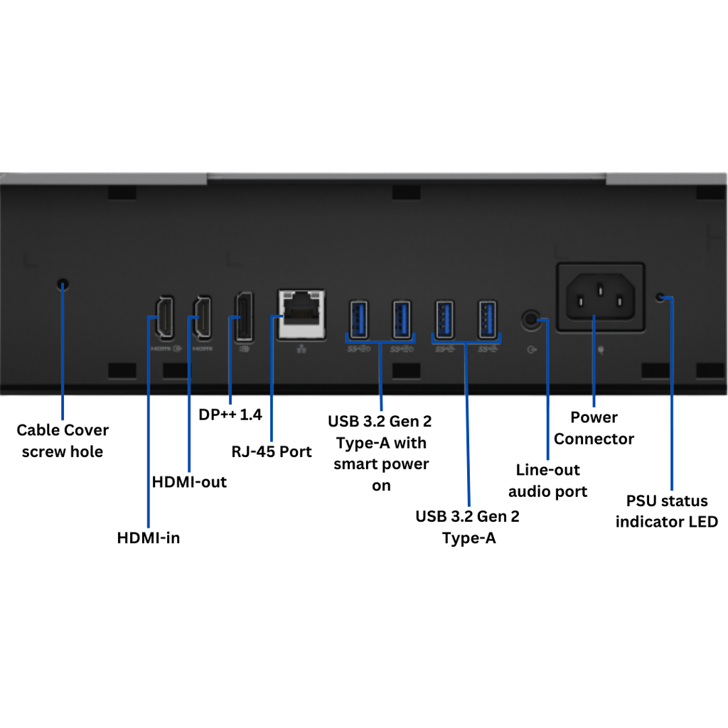 | Ports | HDMI-out, RJ-45, USB 3.2 Gen 2 Type-A, Power connector, HDMI-in, DP++, USB 3.2 Gen 2 Type-A with Smart Power on, Line-out, PSU status indicator LED |